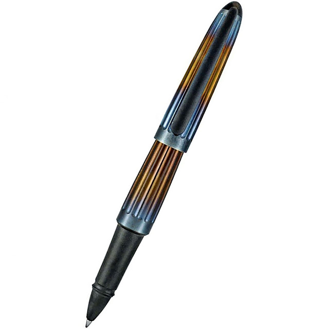 - Diplomat Aero- If you are looking for something that's a bit more unique in terms of design look no further because the Diplomat Aero is quite the piece of modern design. Manufactured from Aluminum and then either anodized or flame treated like the one above, the Aero is a very solid feeling pen and similarly to the Line D the cap is a snap cap which allows for easy and quick removal for notes. The grooves on the pen are not actually only for design but also remove weight from the pen without augmenting the overall shape too much, without these grooves the pen would be to slippery and heavy to use really well. The flame treatment is hand done which means each pen will be unique which is why I really enjoy the heat treatment above the anodized colors. The Aero can be purchased from Pen Boutique in 12 different colors for the price of $156 for the anodized models and $292 for the flame treated.
