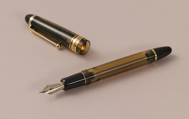 Pilot Custom 823 : Posiblemente uno de los mejores y más rentables bolígrafos jamás fabricados es el 823, que es un hermoso demostrador que tiene un mecanismo de llenado al vacío y una punta Pilot de tamaño n.º 15 que escribe maravillosamente. Si todo eso no fuera suficiente, también viene con una botella grande de tinta azul piloto, lo cual es bueno porque significa que todo lo que necesitas es papel para comenzar a escribir cuando compras tu nuevo bolígrafo. La otra ventaja es que este bolígrafo es excelente como caballo de batalla, incluso con autores como Neil Gaiman escribiendo borradores de libros completos con él y eso se debe a la enorme capacidad de tinta que tiene el cuerpo, que permite sesiones de escritura largas e ininterrumpidas. El bolígrafo viene en 2 colores diferentes para el mercado de los Estados Unidos y esos son el color ámbar ahumado que ves arriba y también viene en color gris ahumado. Japón también tiene una versión transparente pero desafortunadamente no está disponible en los Estados Unidos. El 823 se puede comprar en nuestro sitio en punta fina, media o ancha por el precio de $288.