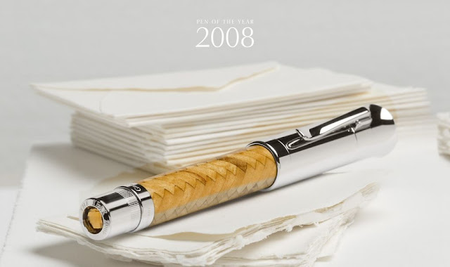 Bolígrafo del año 2008: cada año, GVFC pone a trabajar su creatividad para crear un bolígrafo que muestre lo que la marca puede hacer y supere los límites de lo que se puede hacer un bolígrafo; el modelo 2008 supera esta expectativa por mucho. El POTY es un bolígrafo de tamaño imponente en la mano y tampoco es liviano, lo que le da una sensación muy resistente. Cada vez que tomo uno siento que necesito firmar algún documento importante porque es lo que me imagino que tienen los altos ejecutivos. en sus escritorios (aunque quién sabe si eso será cierto). En este modelo, los artesanos de GVFC dispusieron minuciosamente la madera satinada india en un diseño de parquet en espiga y luego lo terminaron con la vista puesta en que el producto final les dejara boquiabiertos. También se puede ver una piedra de citrino en la tapa del extremo que se desenrosca para revelar la perilla del pistón. En mi opinión, este es el instrumento de escritura de gran tamaño por excelencia y se puede comprar en nuestro sitio web por el precio de $ 3000. Si fuera usted, también estaría atento a sus otros modelos POTY mientras visite nuestro sitio web. ;)