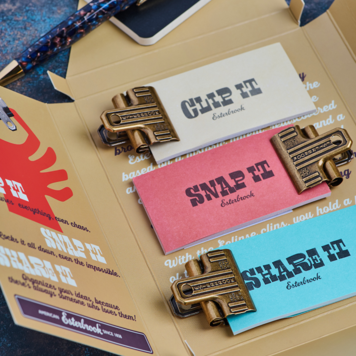 Inspired by original Esterbrook designs from the early 1900s, these vintage-style page clips are modeled after the archival clips once used by professionals and writers to secure pages in journals, books, and ledgers. The small details of this clip, like the ball-bearing hinge and engraved with the original patent number, are intentional design and engineering touchpoints to add a bit of nostalgia to the overall look and feel of the product.