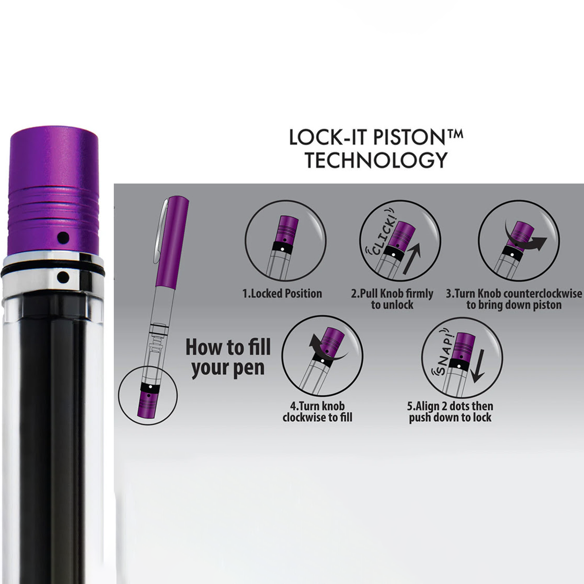 Lock-It Piston Technology – Eco-conscious piston filling system with a 2 ml polycarbonate ink reservoir for longer writing sessions.