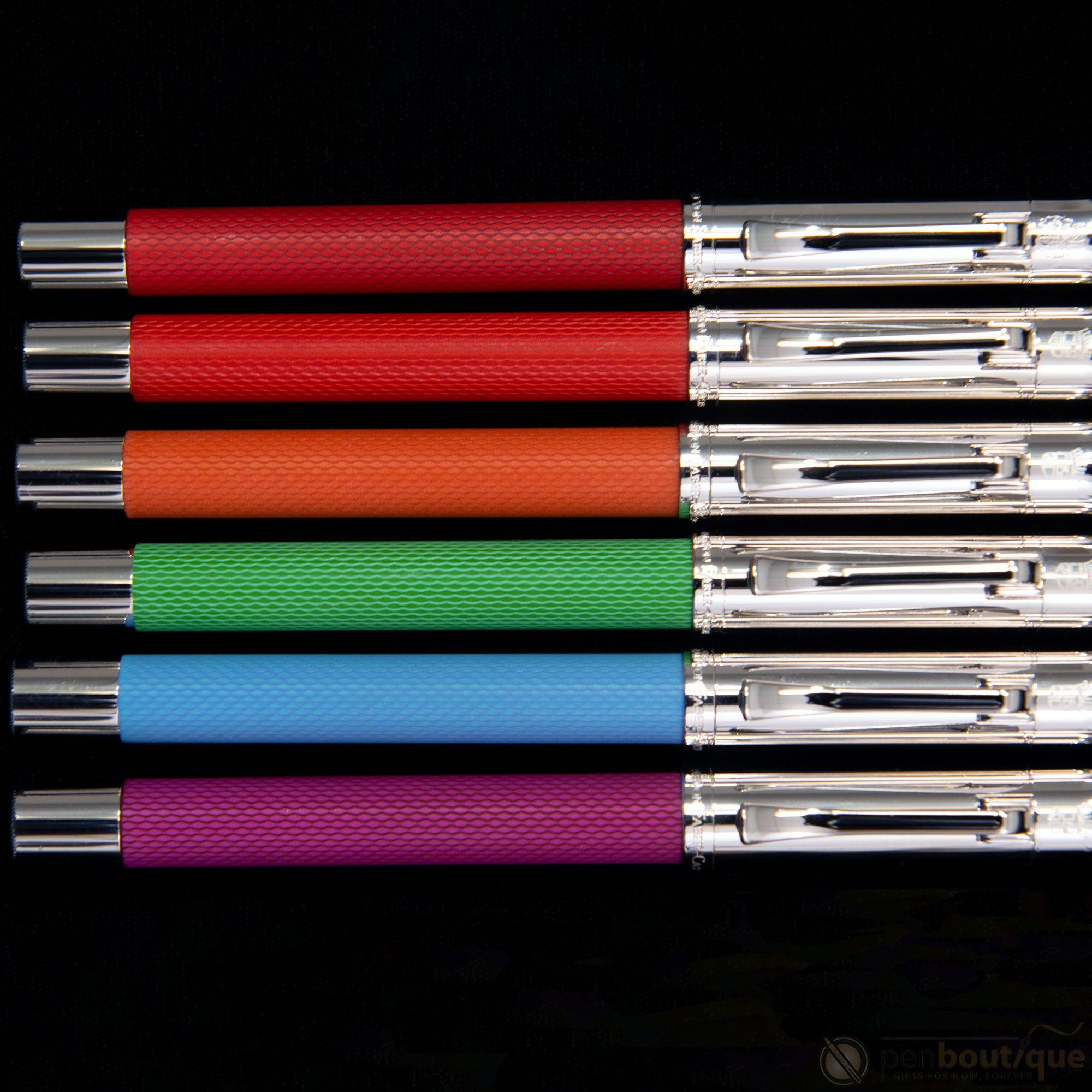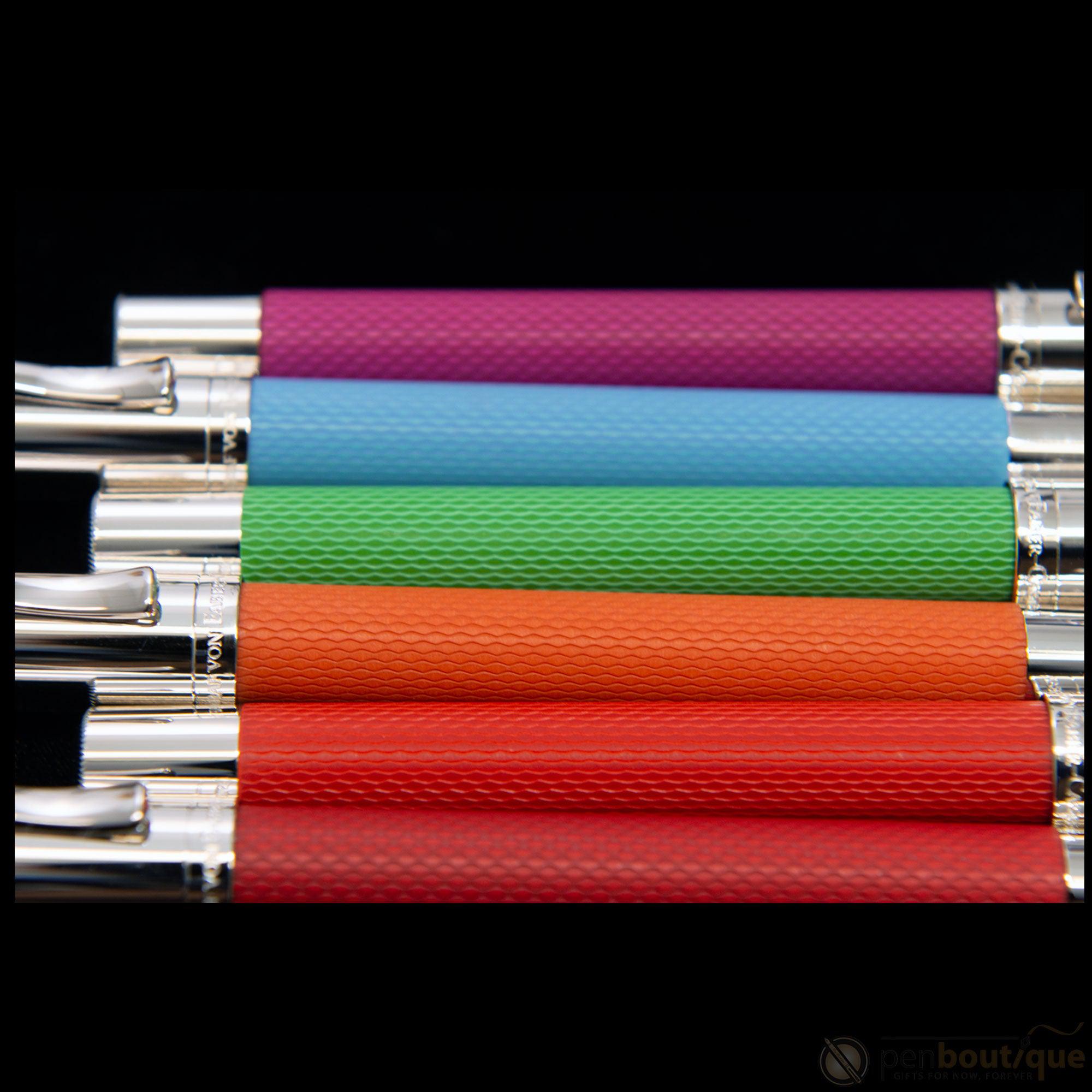 Graf Von Faber-Castell Guilloche Burned Orange Fountain Pen. The Guilloche writing instruments are distinct precious resin made pens. Each pen is engraved individually using a method otherwise reserved for jewelry or silver accessories. The barrel is repeatedly polished and hand lacquered resulting very interesting surface texture. Each writing instruments is example of craftsman’s art. These writing instruments feature hand-made 18-carat gold nib (rhodium plated) available in various nib sizes. These gorgeous writing instruments come in elegant and intuitive gift boxes.